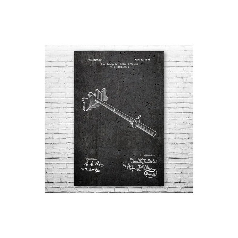 - 9" x 12" poster print featuring a Cue Bridge patent illustration on a Dark Concrete style background. Designed by Patent Earth, this wall art is made to order and customized with your choice of size and background!