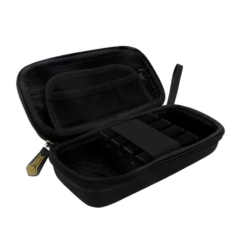 Holds one set of fully assembled darts A wide elastic strap is added on the top to prevent the darts from moving inside. Large zippered locking pocket is designed to hold dart barrels, shafts, cards, smartphones, and other extra accessories.