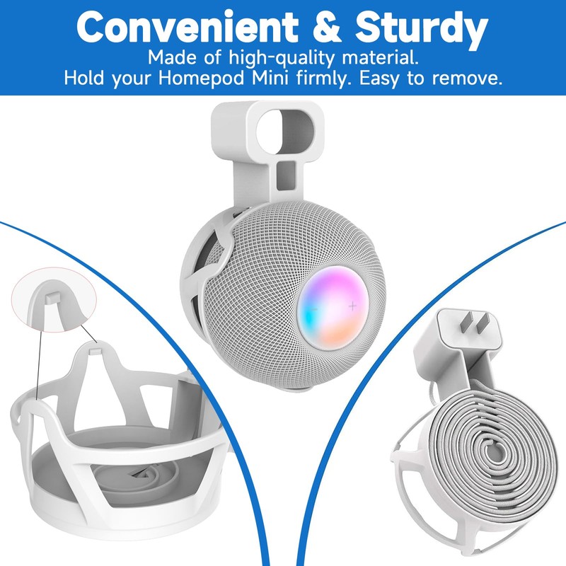 • Easy to Install - No drilling holes or screwing. Just plug your Homepod mini into the Homepod Mini wall holder, and then wrap cords around the reel and hide them perfectly on the back of the Homepod Mini outlet wall mount.