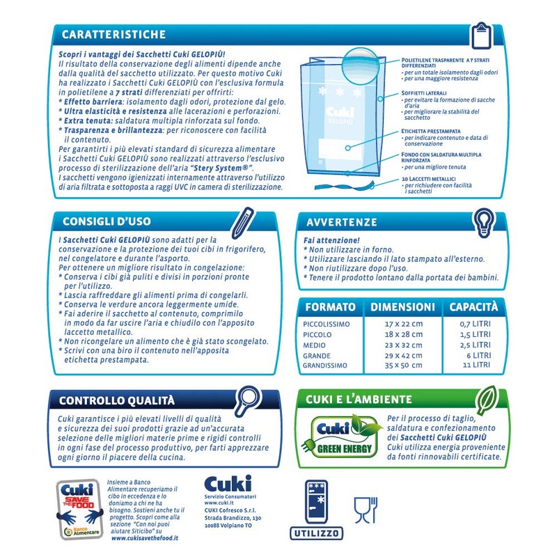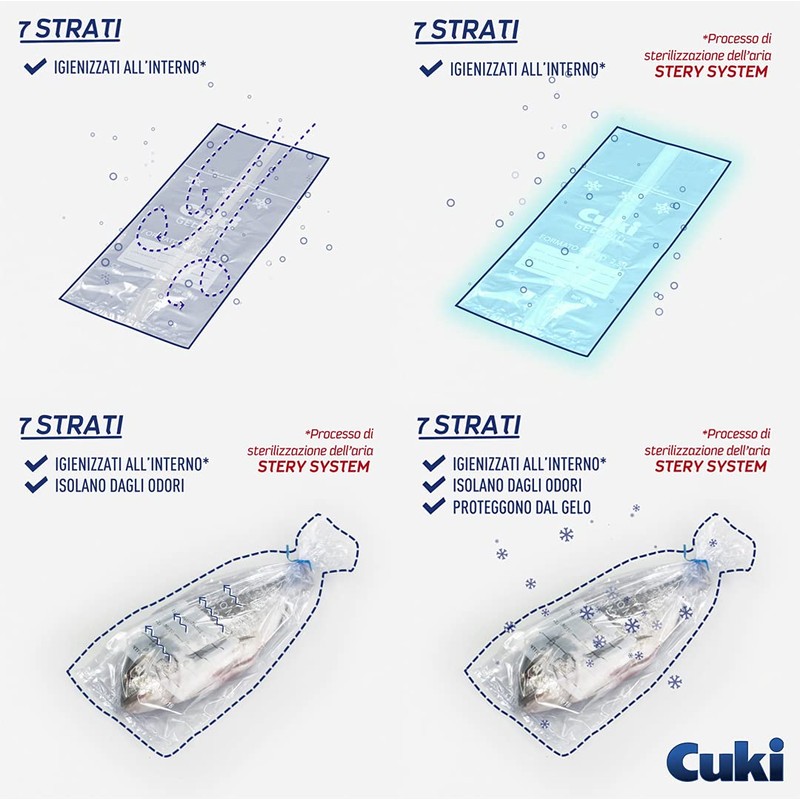 - Cuki Gelpiù vacuum cleaner bags are made with the unique 7-layer polyethylene formula to prevent frost, odour insulation, extremely resistant, transparency.
