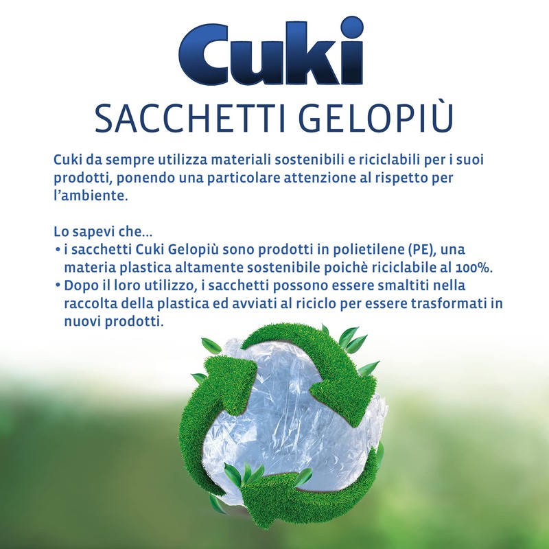 - Cuki Gelopigio bin liners are made from polyethylene (PE), a very sustainable plastic, as it is 100% recyclable. They must be disposed of in the plastic separation collection.