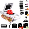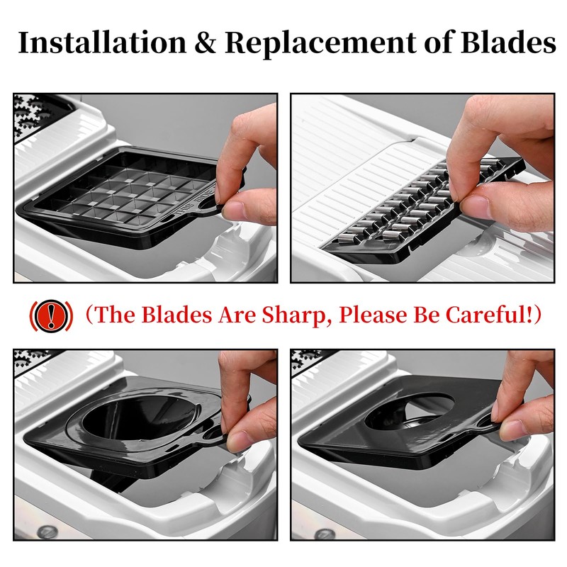 - Multi-Purpose & Multi-Function: Everything you need in CUKITISH multifunctional all-in-one Veggie Slicer Chopper Dicer and Cutter with 11 different interchangeable blades. (11mmx11mm Large Dicer, 6mmx 6mm Small Dicer, GarlicGrinder, 4mm Shredder, 3mm Fine Shredder, Slicer Blade, Potato Lattice Blade, Spiral Blades, Ribbon Blades, Peeler, Egg Separator) All blades can be replaced at will. Also comes with Hand Guards, a Blades Storage Box, a Drain Strainer, and a Cleaning Tool.