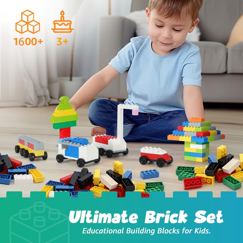 - 1600 Building Block Set: You will get a full set of over 1600 pieces building bricks in 12 vibrant colours and 14 shapes, plus 46 bonus wheels, tyres and axles for endless building fun. Build over 8 vehicles and planes with ease
