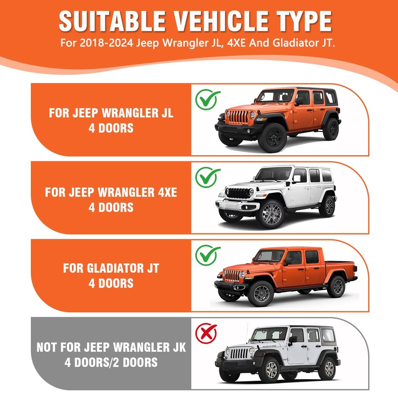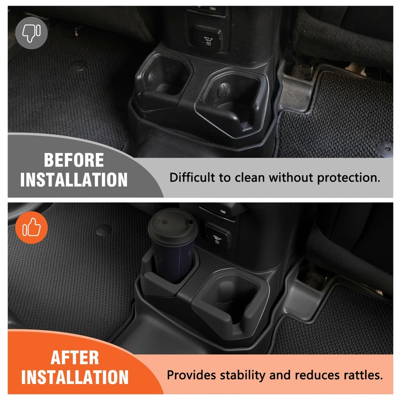 - Perfect Fit – Compatible with 2018-2024 Jeep Wrangler JL/JLU/4XE & 2020-2023 Gladiator JT 4 door. Not compatible with JK models. Note: This coaster is suitable for the original car rear drainage cup holder