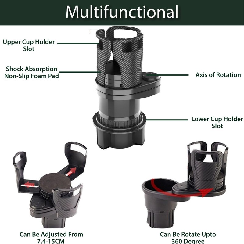 • Multifunctional: Our adjustable car cup holder expander can be rotated 360°, split in half and instantly transform into two available slots by rotating upper holder. One cup holder car can be uses as two up holders. The upper cup holder extender has the function of stretching and shrinking, can be extended from 2.95-6.69 inches, which can hold larger water cups, thermos, cell phones, food, ipads, fries & noodles, etc.