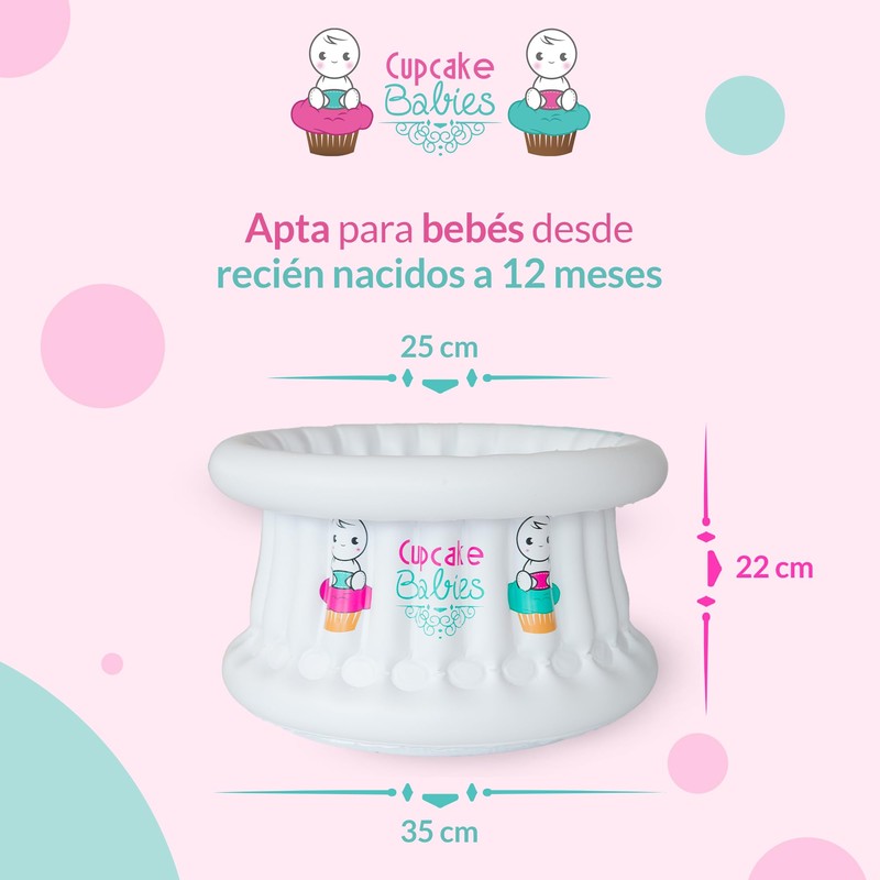 - PACK BASICO | El Basic Pack incluye una bañera inflable Cupcake Babies de 22 x 35 x 25 cm en color blanco, apta para recién nacidos hasta 12 meses y un bolso de viaje. Todo lo esencial para el baño y diversión de tu bebé en cualquier lugar.