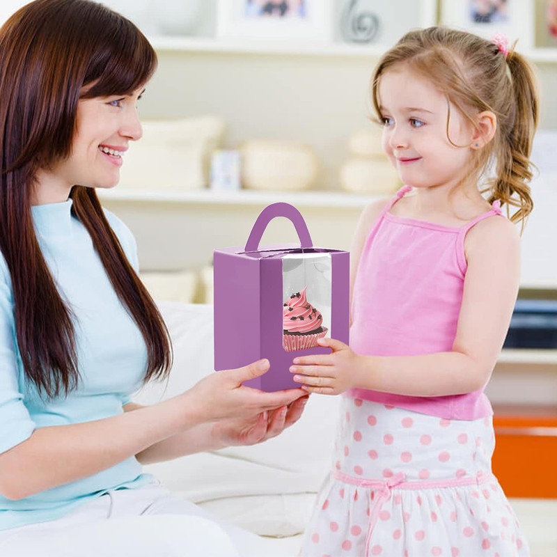 Cupcake Boxes, 30 Pcs Single Cupcake Boxes Individual Cupcake Containers Muffins Cupcake Carriers Holder Kraft Pastry Containers with Insert Window & Handle for Wedding Birthday Parties (Purple)