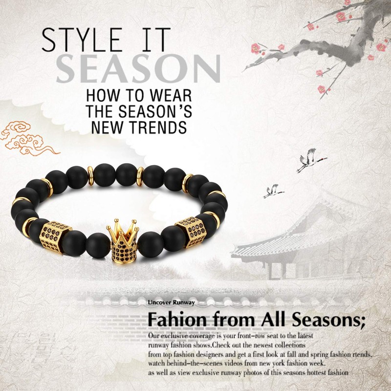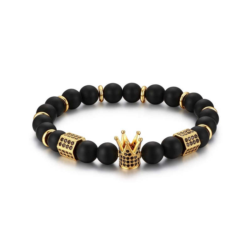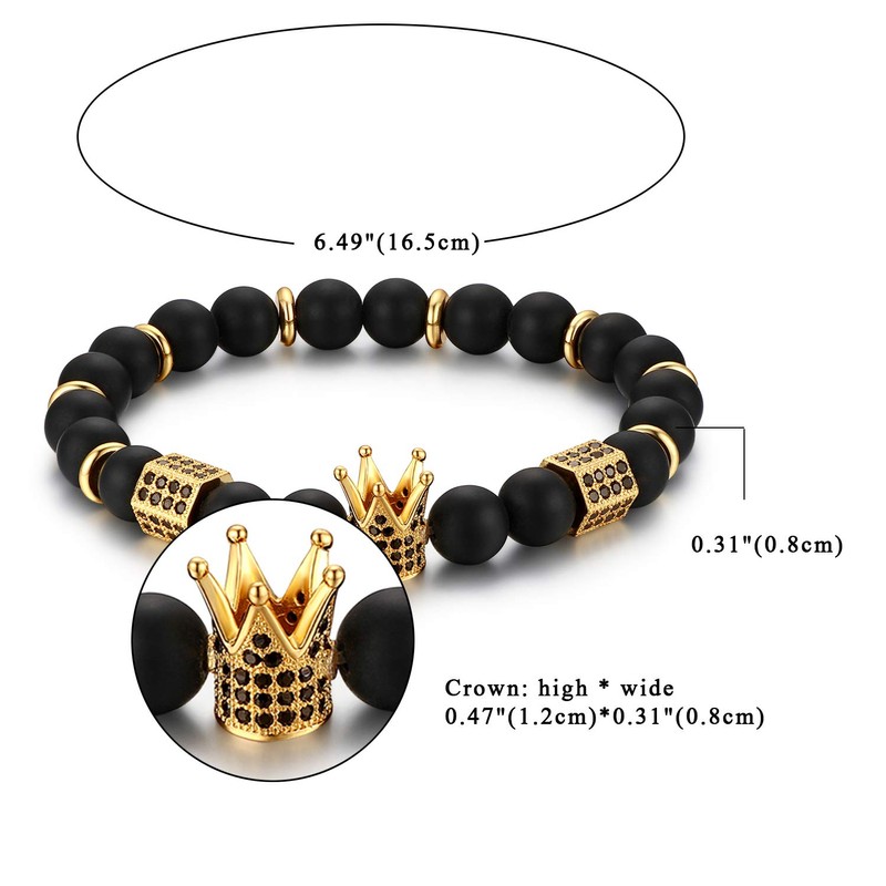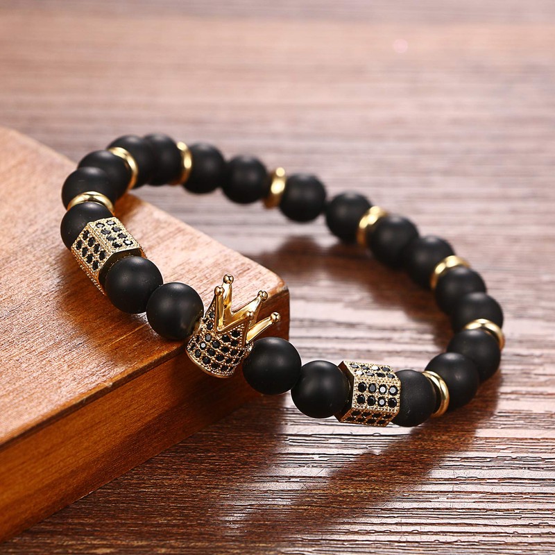Cupimatch 8mm Beads CZ Crown King Charm Bracelet for Men Women 7.5",Blackgold