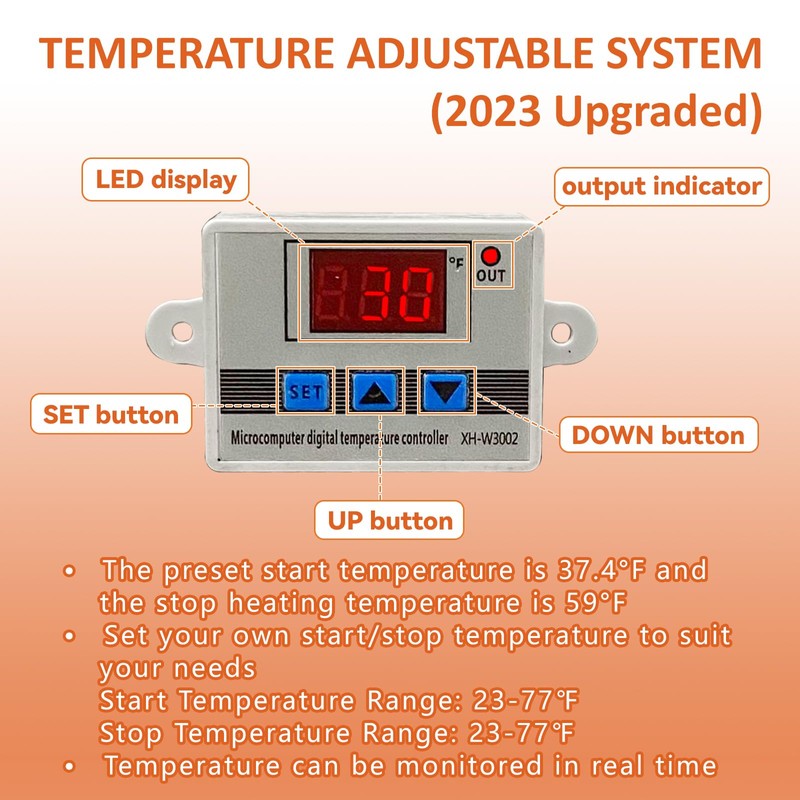 - Digital Display Thermostat: Our temperature adjustable system not only adjust the temperature range for starting and stopping heating(41°F~59℉/5°C~15°C), but the display reflects the current temperature in real time. And the upgraded temperature sensing probe is also more sensitive than the old version