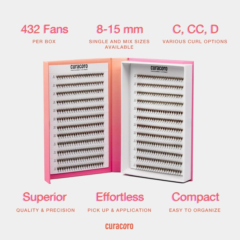 - QUALITY & COST-EFFECTIVE — Made from premium PBT material, Curacoro Lashfolio Promade Fans are checked 100% by hand before releasing to the market, ensuring zero broken lashes. Each box contains 480-520 fans, 4 times the amount of other volume lash trays, allowing you to offer your clients stunning lash extensions while staying within your budget. With a thickness of 0.03 ~ 0.07, available in C, CC, and D curls, you can create a customized lash style for each client.