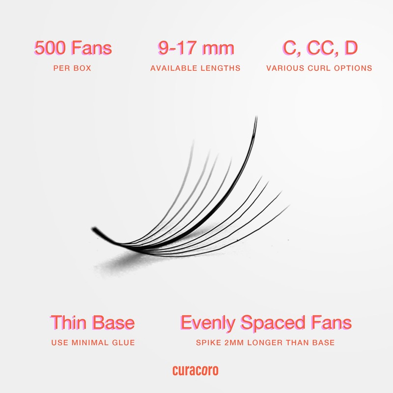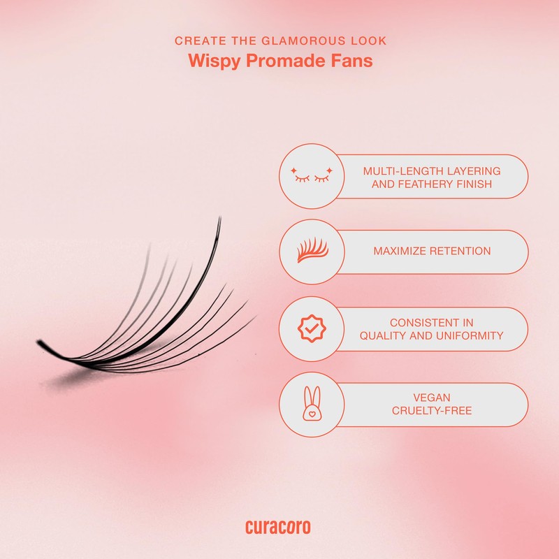 • WHY CURACORO PROMADE WISPY FANS — Handcrafted from premium PBT material, these wispy lashes are soft, dark, and sleek, with a petite base for easy application. Loved by lash artists around the globe, our Promade Wispy Fans deliver exquisite, wispy lash extensions with unmatched quality and performance. Trusted by experienced eyelash technicians worldwide, Curacoro Promade Wispy Fans set the bar high for creating stunning, voluminous looks.