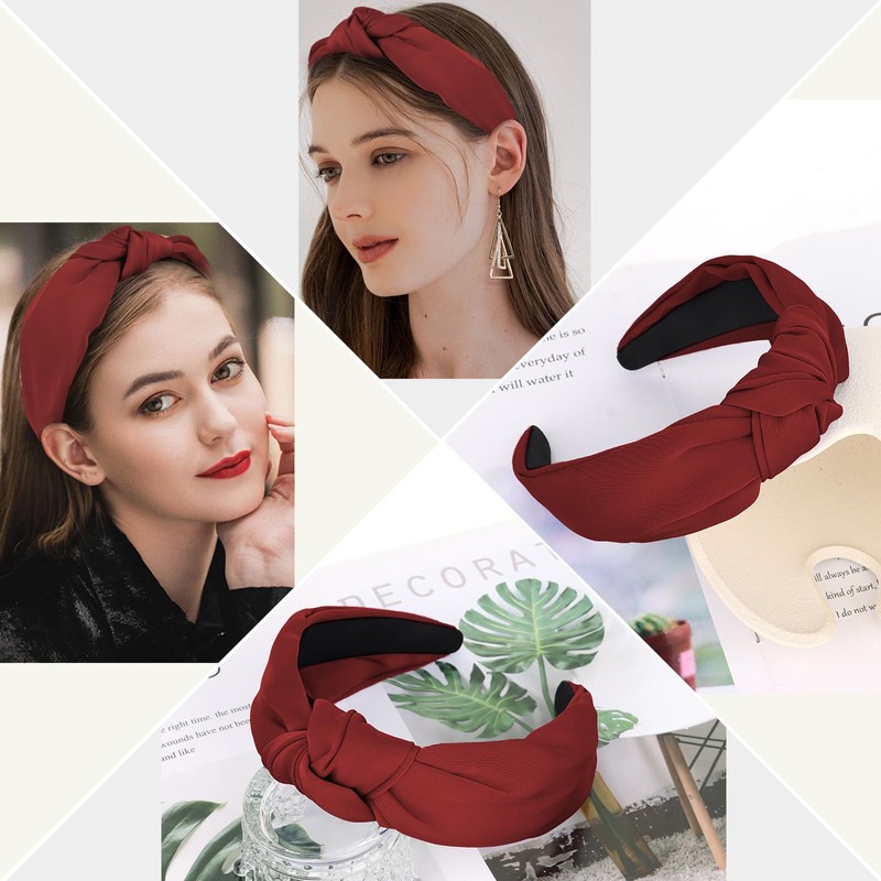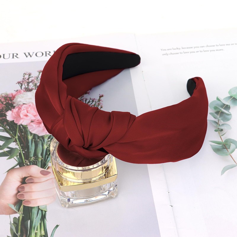 CURASA Knotted Headbands For Women Girls Non Slip Wide Headband Cute Fashion Hair Accessories Wine Red Preppy Fabric Terse Headbands Top Knot Headband For Thick Thin Curly Hair