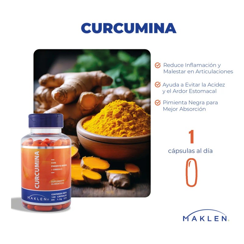 ¡Absolutamente! Aquí tienes las descripciones larga y corta para el producto "Cúrcuma | Curcumina con Pimienta Negra + Omega 3 | 140 Softgels | Maklen", siguiendo tu formato y destacando sus potentes beneficios antiinflamatorios y de bienestar integral: