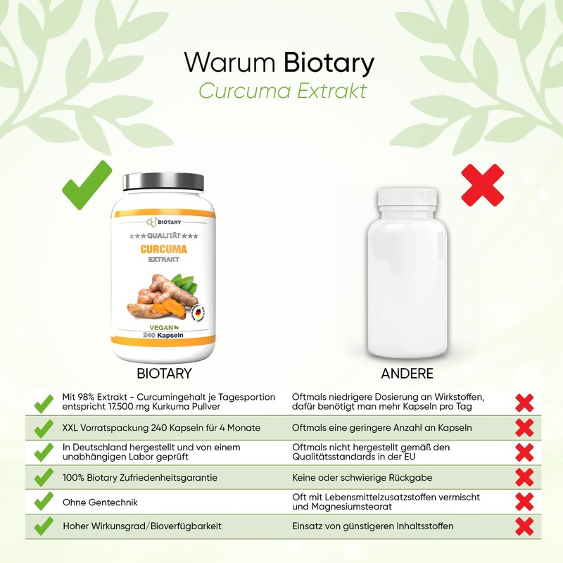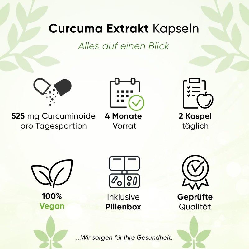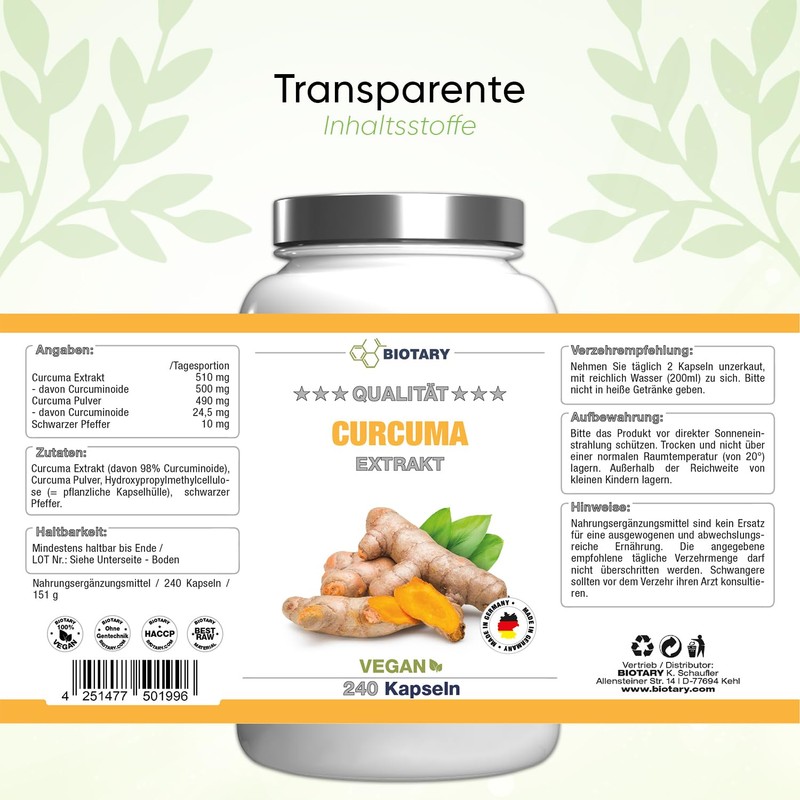 • Curcuma extract: 240 vegan capsules high dose with 98% extract. High curcumin content (curcuminoids) of 525 mg per daily serving (2 capsules), which is approx. 17,500 mg turmeric powder. Sufficient for a 4 month supply.