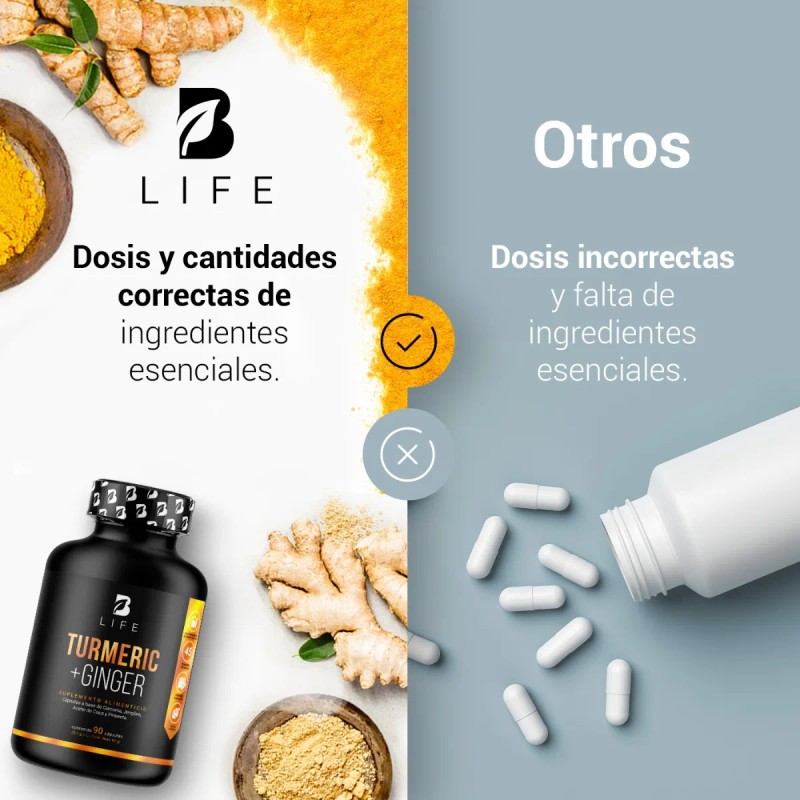 ¡Disfruta la formulación de Turmeric + Ginger B Life! Cada cápsula de 700 mg contiene una increíble composición a base de Cúrcuma, Jengibre, Aceite de Coco y Pimienta Negra, a diferencia de otras presentaciones que carecen de esta valiosa sinergia de ingredientes valiosos para tu bienestar. Contiene 90 cápsulas.