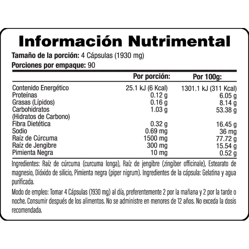 Este suplemento reúne tres potentes ingredientes: curcumina de cúrcuma, gingerol del jengibre, y piperina de pimienta negra. La combinación ofrece: