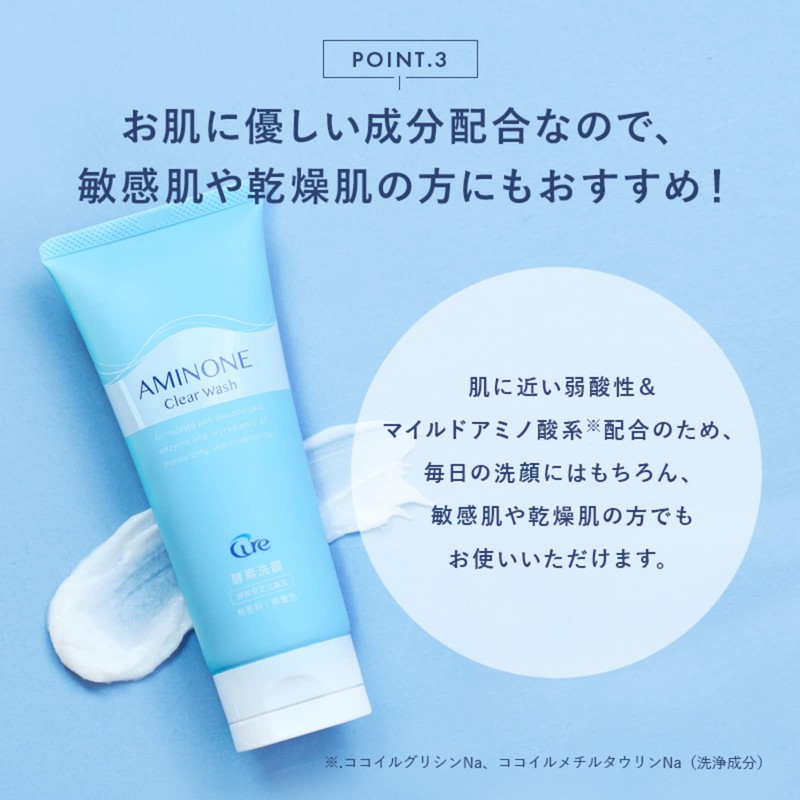 - The Aminone Clear Wash is an enzyme wash that leads to smooth and smooth skin. Protein degradation enzymes x 2, amino acid cleaning ingredients x 4, thoroughly dissolves blackhead stains and square plugs in the pores, adsorption with 5 ingredients