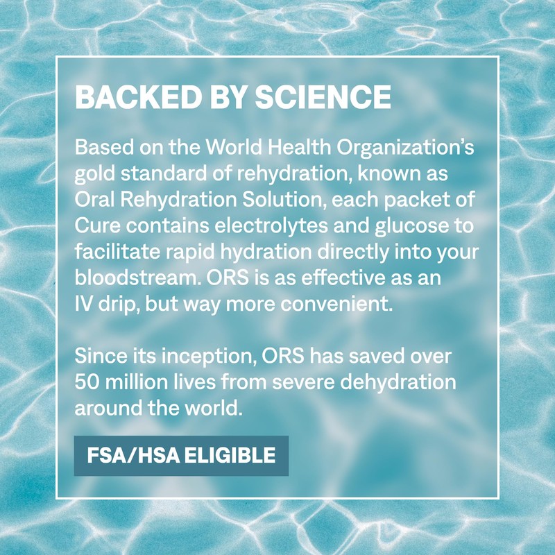 - RAPID ABSORPTION: Based on the World Health Organization's gold standard of rehydration, known as Oral Rehydration Solution, each packet of Cure contains electrolytes and glucose to facilitate rapid hydration directly into your bloodstream. ORS is as effective as an IV drip, but way more convenient.