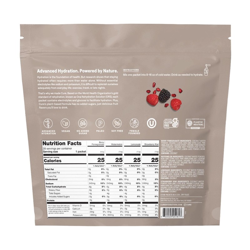 - POWERFUL DEHYDRATION RELIEF: Named by Women's Health as the Best Hydrating Drink Mix! Hydration is the foundation of health. However, science shows that staying hydrated often requires more than water alone. With 4x the electrolytes of leading sports drinks, Cure restores balance to your body so you can operate at 100%.