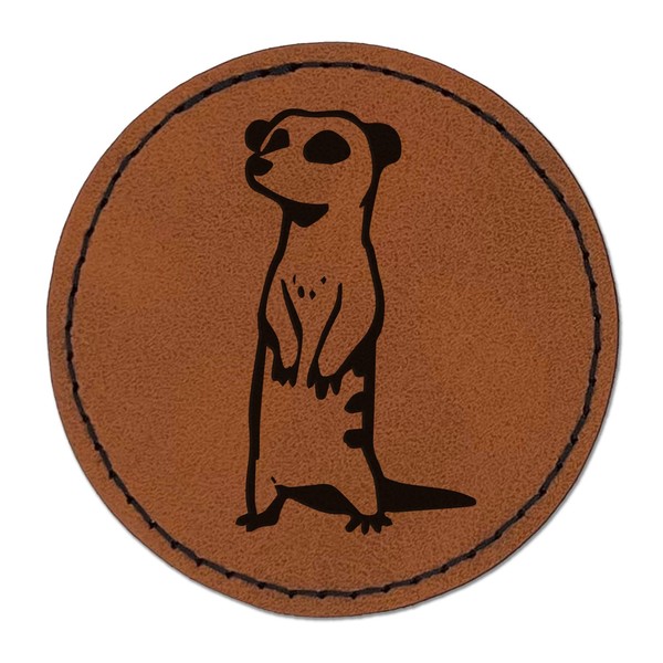 Curious Standing African Meerkat Round Iron-On Engraved Faux Leather Patch Applique - 2.5 Inch - Brown