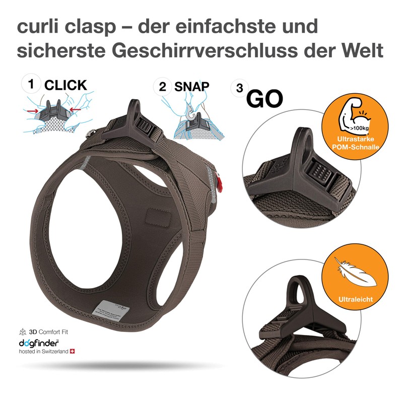 - Perfecting the best-selling dog harness: The curli safety harness is around 20% lighter than its predecessor (33 g) and comes with significantly improved ergonomics and an optimised fit!
