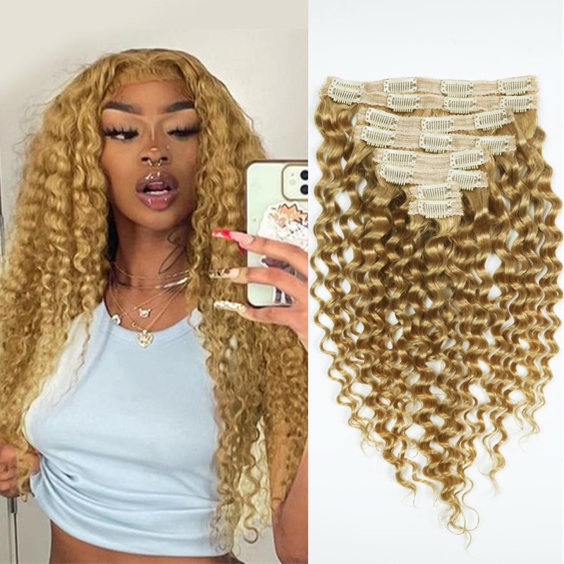 Curly Clip in Hair Extensions Real Human Hair 18inch 120g Invisible & Seamless 100% Brazilian Remy Human Extension Deep Wave Clip ins Extensions Double Weft 8 PCS with 20 Clips #27 Honey Blonde