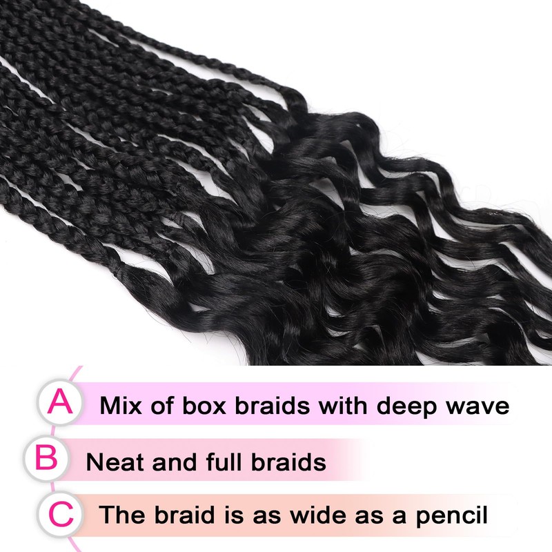 - The Mixture of Box Braids with Deep Wave: The crochet box braids between small and medium sized, it neat fluffy and does not stick to your scalp, ethereal deep wave ends, soft and bouncy, easy manageable,giving you that effortlessly chic look
