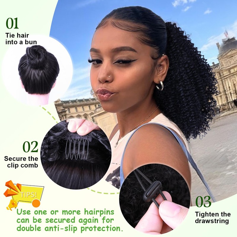 - ❤[Easy to Wear] To wear this ponytail extension, you only need to wrap your hair into a bun, clip it on, and tighten the drawstring, and the style is ready, and very simple. Very stable and comfortable to wear all-day,It is recommended to wash and leave it on a towel to dry naturally to keep your curls lasting