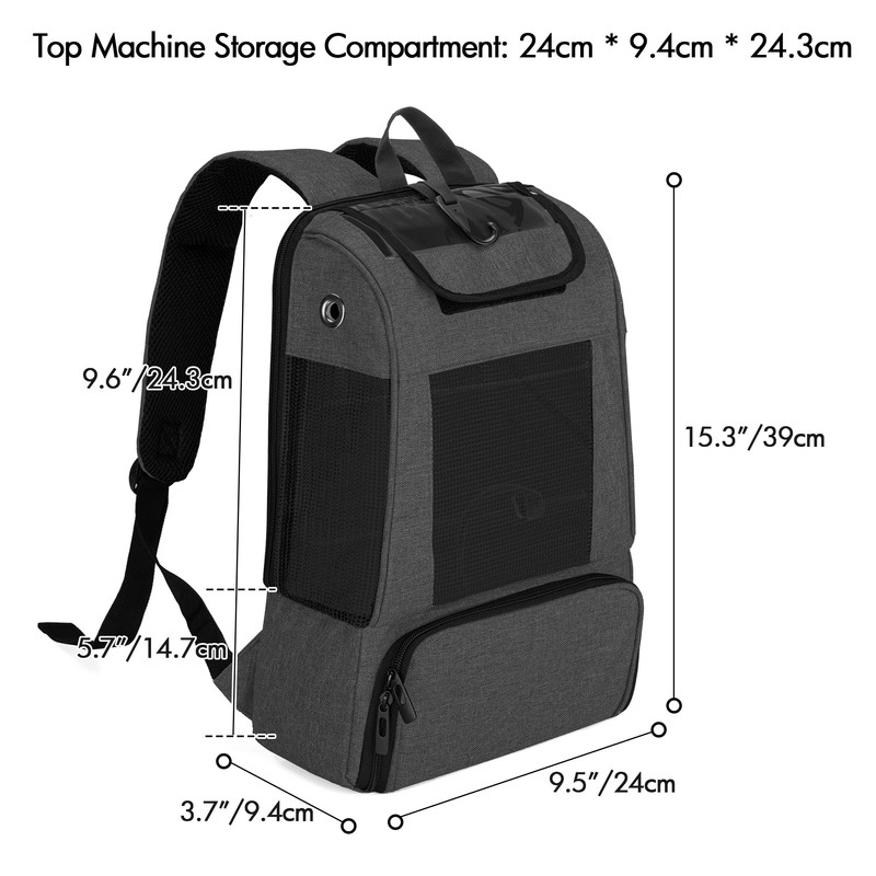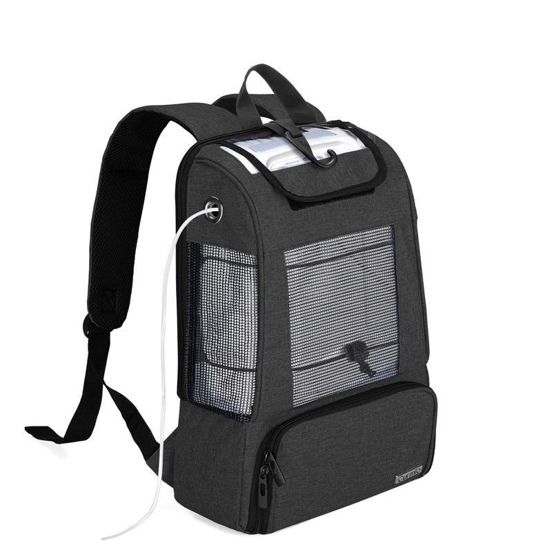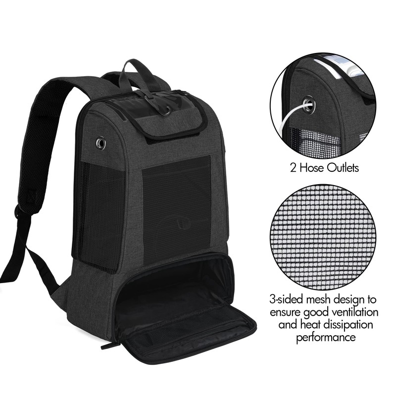 - WELL DESIGN: Upper compartment with two-way zipper large opening for easily storing and accessing the oxygen generator. The transparent flap with hook and loop fastener closure for viewing display screen. Nasal cannula or charging cord can come out from both sides of the top or from 2 hose outlets.