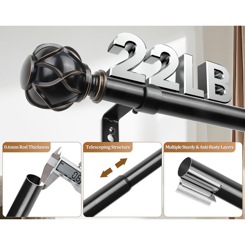 - Sturdy and Durable: With 3/4 inch diameter and 0.6mm rod thickness, the weight capacity of heavy duty curtain rod could up to 22 pounds and capable of holding heavier fabrics. Curtain rods for windows including four colors: Bronze, Black, Antique Silver, Gold, ranging from 28-48 Inches, 32-58 Inches, 48-84 Inches, 66-120 Inches