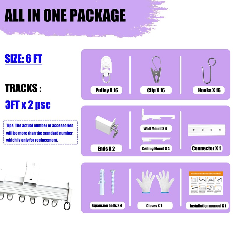 - 【Hassle-Free Installation】Everything you need in one box: tracks, connectors, rollers, hooks, end caps, screws, and mounting brackets (ceiling/wall). No extra trips to the hardware store—just follow our step-by-step video guide for a quick, tool-friendly setup.