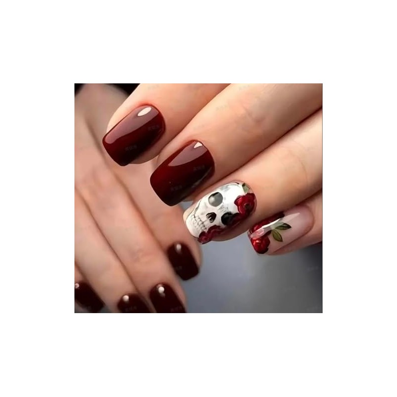 Curvlife Press on Nails Acrylic Fake Nails with Design Full Cover False Nails Reusable Nail Kit with Nail Glue Adhesive Tabs Nail File Artificial Glue on Nails (Red skull, 30pcs)