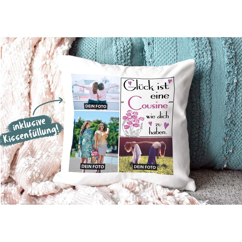 - A very special photo gift personalised yourself – lovingly and personal – the best gift for your favourite cousin – a high-quality photo cushion with three own photos – a great memory