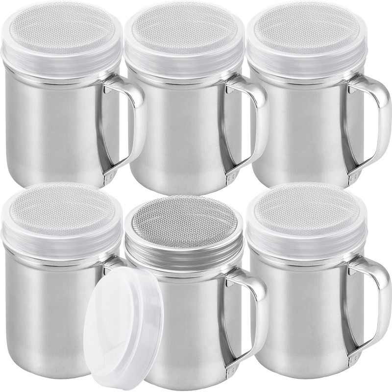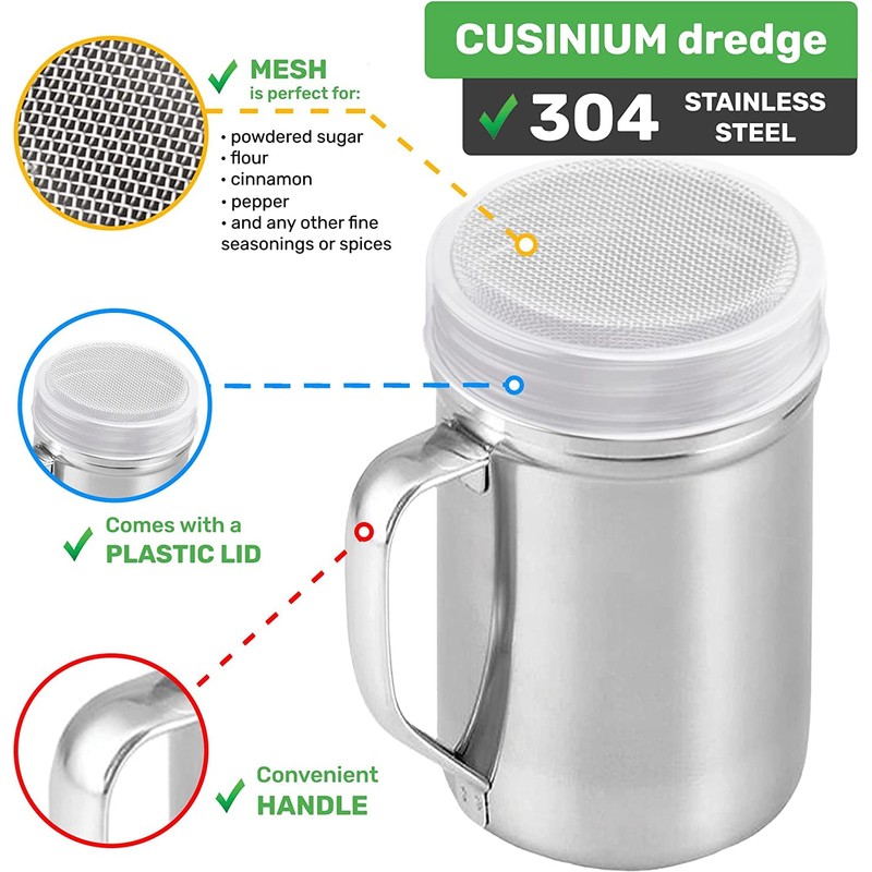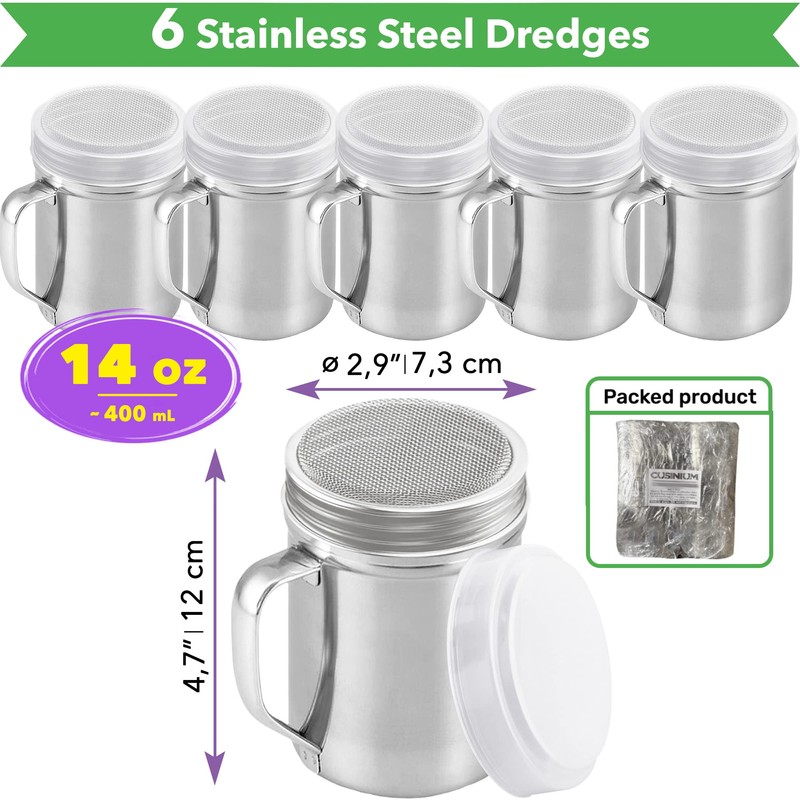 CUSINIUM set of six large dredges with handles, each with a 14 oz. capacity, perfect for commercial use or for those who use a lot of spices and want to refill less frequently. Features: Made of the highest grade 304 stainless steel material that is corrosion-resistant and durable Fine mesh top allows for an even and controlled distribution of ingredients, ensuring that every bite is equally delicious Ideal for large amounts of fine powders such as fine salt, powdered sugar, pepper, paprika, onion powder, flour or any other fine spices for your favorite dishes Come with a twist-off lid featuring a plastic cover that keeps your ingredients fresh and spill-free Easy to clean in a dishwasher with metal-friendly detergents Restaurants, cafes, food trucks, bakeries, coffee shops, catering businesses, hotel kitchens, concession stands in places like movie theaters, sports stadiums, and any other food-related business that requires precision seasoning could benefit from having a set of six large dredges on hand.