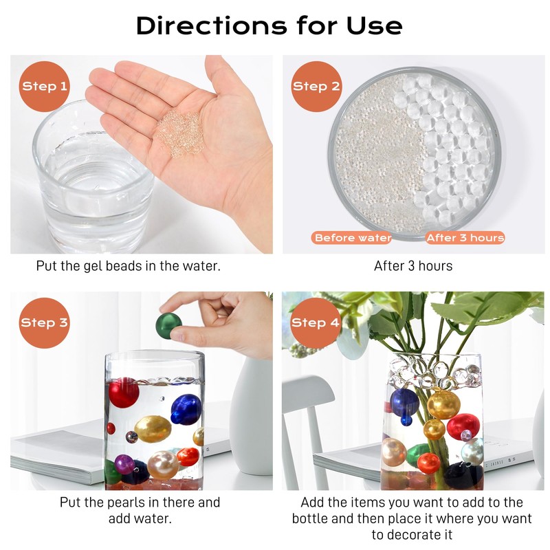 - Method of use: Simply submerge the gel beads in water and within 3 hours the gel beads will expand to 0.4 inches, then drop in the pearls you wish to decorate to create a stunning floating bead centerpiece. Note: Pearls require the presence of gel beads to float on water.