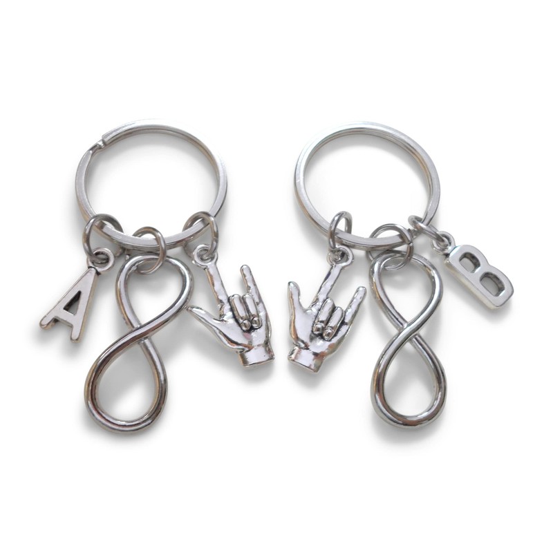 Custom 2 Infinity & ASL I love you Hand Charm Keychains with Initial Charms for Couples or Best Friends, Anniversary Gift Keychains