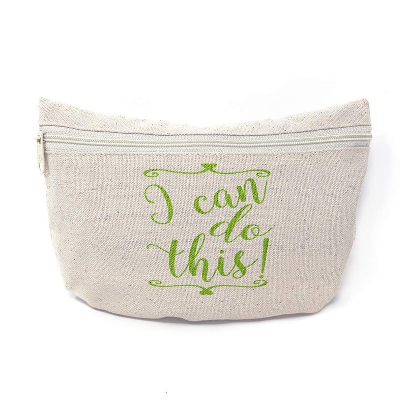 The design's text reads: i can do this!. Perfect for someone looking for: Available travel accesories, Achievable makeup bag, Desirable jewelry bags, Potential pencil pouch, and Probable toiletry bag.
