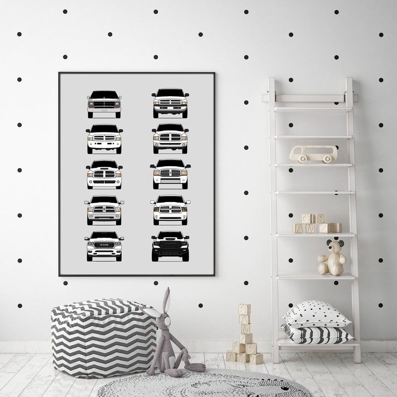Poster print inspired by the complete history of the Dodge Ram Pickup Truck. The Dodge Ram is an American icon and the pinnacle of the Pickup Truck world. This print will look absolutely beautiful in your home, office, or garage and would make the perfect gift for a Dodge or Pickup Truck enthusiast!