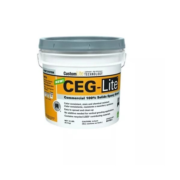 CEG-Lite Commercial Epoxy Grout, a lightweight 2-part 100% solids epoxy grout formulated with Custom’s exclusive Custom Lite Technology. CEG-Lite represents a major breakthrough in epoxy technology, delivering the high stain and chemical resistance professionals expect, combined with handling characteristics and versatility that far surpasses other epoxy grouts. CEG-Lite Epoxy Grout is formulated with the same recycled content found in Custom’s other lightweight setting materials, making it the first 100 percent solids epoxy grout that contributes to LEED certification based on recycled content, which also affects the handling of the product, giving a smoother consistency providing increased spread ability. NOTE: The following colors were discontinued in March 2015 and will only be available while supplies last: Antique Linen, Quarry Red Clay, Chaparral, Canvas, Camel, White Dove, Arctic Ice, Moss, Butter Cream, Ocean Blue, Burnt Clay, Bay Leaf, Onyx Green, Slate Gray, Admiral Blue, Bonsai, and Rose Beige.