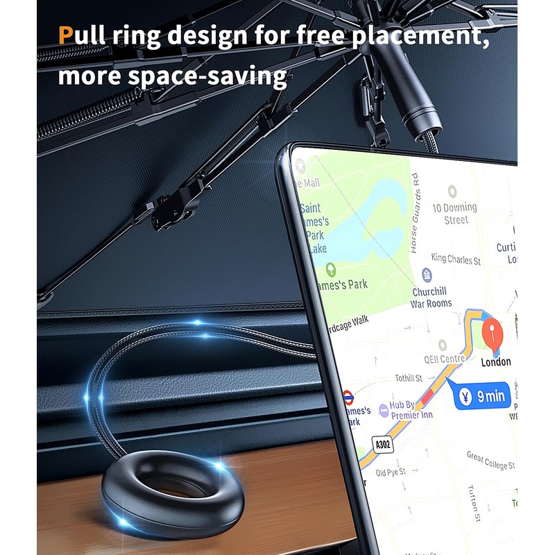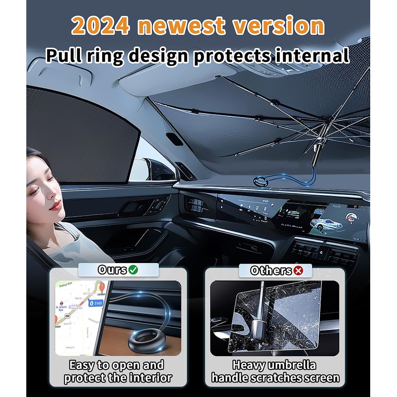 - 【Upgraded with Pull Ring Handle】2024 windshield sun shade is much improved: it just has a simple ring on a rope to retract the umbrella - no handle to get in the way! The pull cord is just a flexible cord so you can easily lay it on the dash and not have it touching the display screen below it.