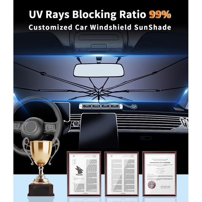 - 【Durable Construction & Easy to Store】A practical sun protector for car windshield. The sunshade umbrella has made with double-layered material and a reinforced metal frame to ensure sun protection effect and long-lasting use. It is also a car window cover provides privacy and security by covering the inside of your car. Compact size makes it conveniently to be stored at the side doors or co-pilot storage case.You can always have it on hand when you need it, without taking up much space.