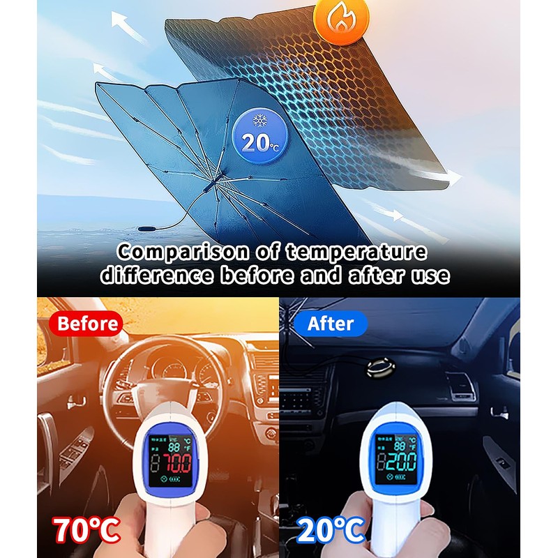 - 【Efficient Sun Protection】Our car windshield sunshade made of high-quality reflective materials that provides excellent protection against sunlight, heat, and UV rays, keeping your car inside cool and offer comfortable driving experience even in the hottest summer days. Sunshade for car windshield can block up to 99.9% of harmful UV rays and protect your car's interior from sun damage.