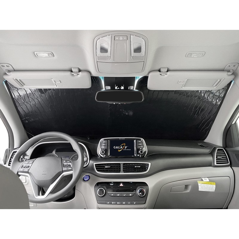 GalaxyAutoShield dual-purpose sun shade features a glossy metallic silver exterior with a glossy black interior. The silver side (Front Panel) keeps interior temperatures cool in the summer while protects your vehicle's interior from harmful UV rays. The black side (Rear Panel) helps keep the interior warmer and prevents frost build-up in the winter. Installation is also easy and quick.
