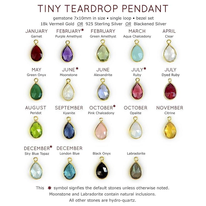 | Material Type: | METAL ✦ GOLD: Birthstones are 18K Vermeil gold, chain and all other parts are14K gold filled. ✦ BRIGHT STERLING SILVER: All metal parts are sterling silver. ✦ OXIDIZED (BLACKENED) STERLING SILVER. All metal parts are sterling silver. |