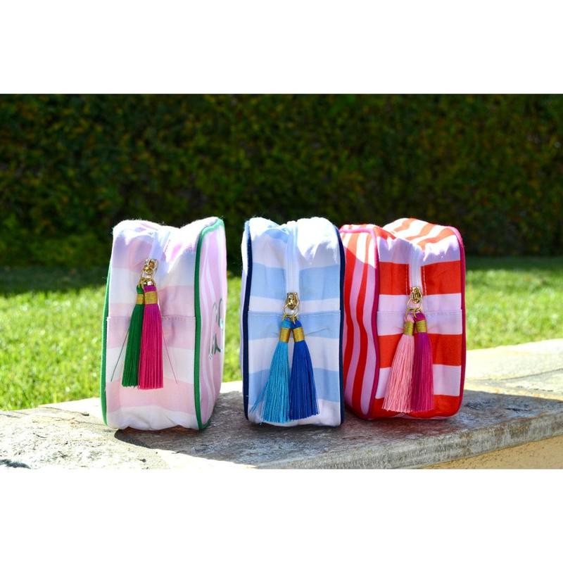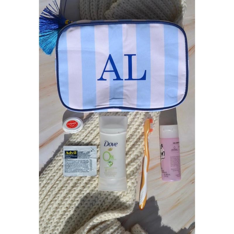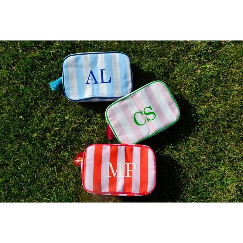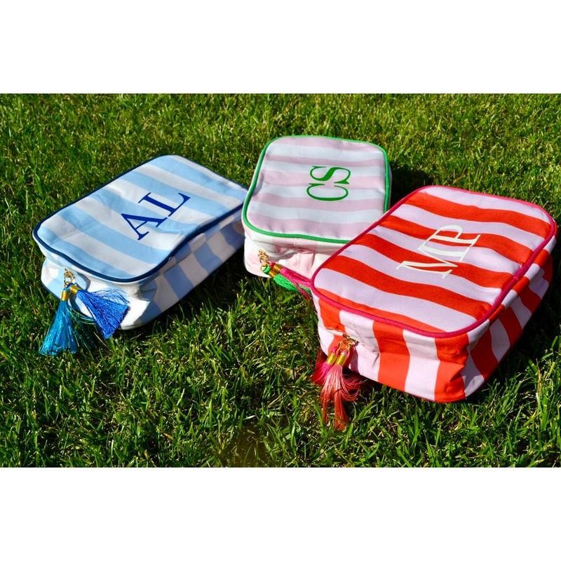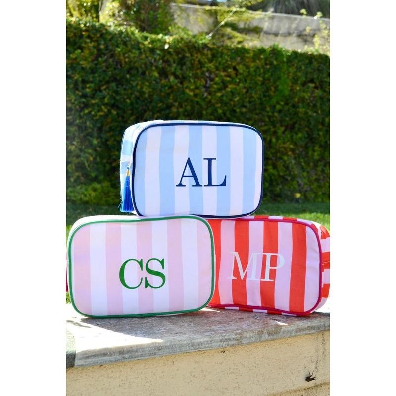 Monogram Makeup Bag Adorable & Functional all in one! These custom monogram toiletry bags will keep all your makeup/toiletries in one place! Waterproof on the inside so can also be used as a wet swimsuit baggie. Get one for yourself or treat your bridesmaids to a beautiful surprise by adding this item to your bridesmaids proposal bag or gift it to them for your bachelorette or wedding day getting ready kit! Get the bags plain or with custom initials Can have 1-3 letters (same price) Enter initials into personalization section like so- EX: VB, MH, LP, MHM Canvas Exterior, plastic interior 9"wide x 6"talll x 3" deep Available bag colors (3): pink+green/blue+white/red+pink Available font colors: green, white, and navy (if you would like other font colors, please message us!) Initials are ironed on vinyl Gold zipper with tassel details $12/plain bag | $15 for custom initials Bulk discounts only available for orders of 30+bags