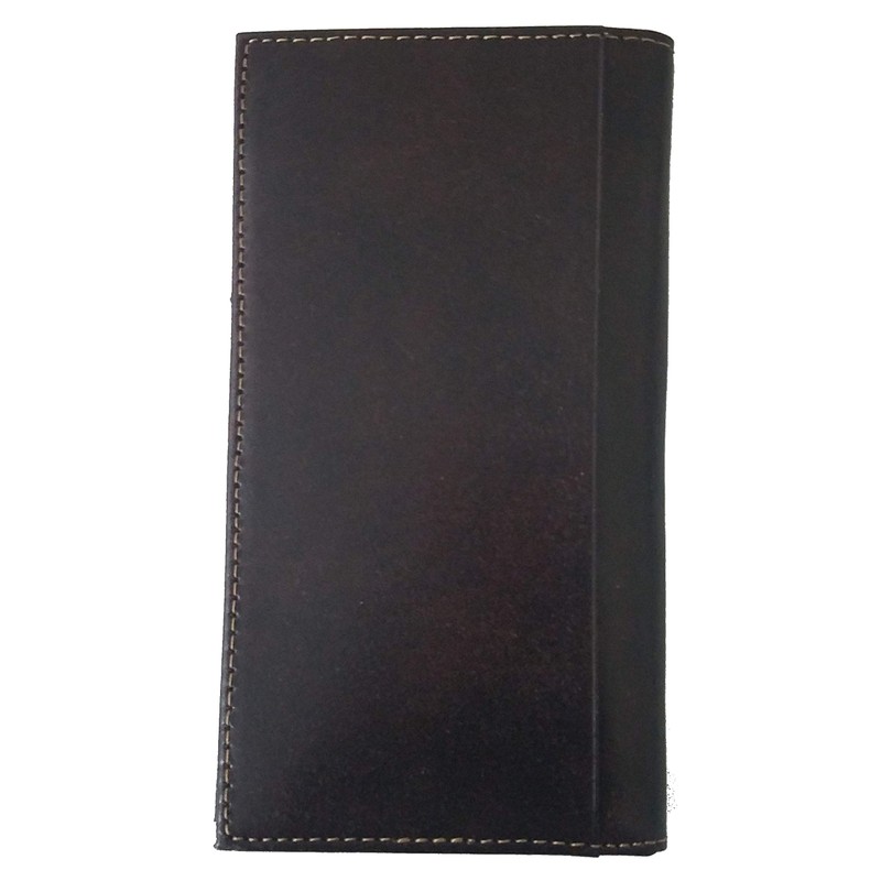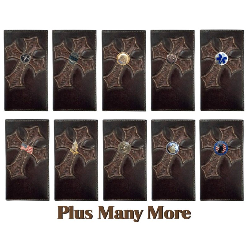 A genuine licensed Chocolate Nocona leather checkbook/rodeo wallet features a large tooled Cross resting diagonally on the front customized by Genuine Texas Brand with the concho of your choice. Inside features a clear ID slot, credit card slots, removable photo slip, checkbook and money slot