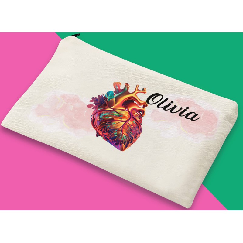 Custom Name Anatomical Heart Cosmetic Bag - Canvas Bag, Christmas Gift for Friends - 9 W x 6" H