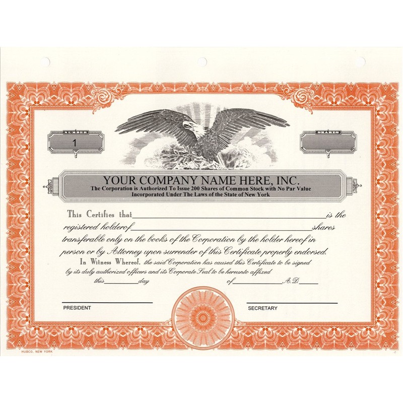 Custom Printed Corporate Stock Certificates, HUBCO, Orange, 20-Pack