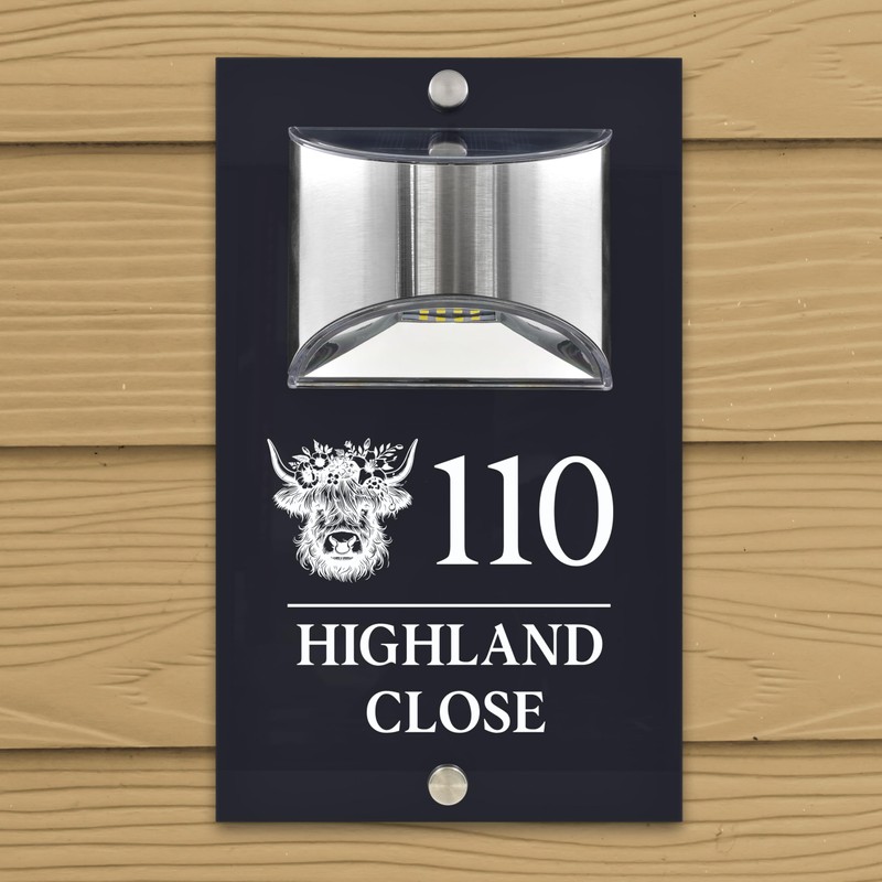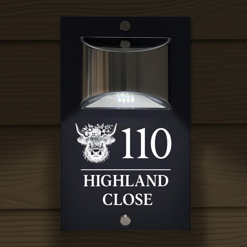 Custom Signs Solar Illuminated Modern Anthracite House Number Sign 24cm x 14.5cm Highland Cow Design