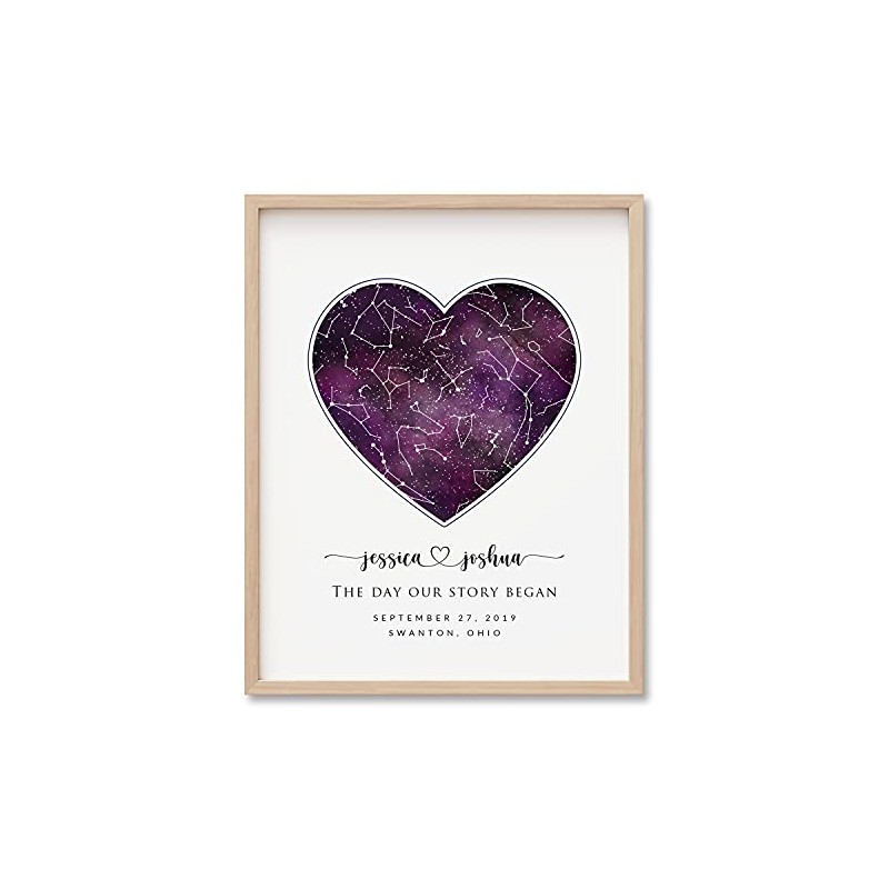Custom Star Sky Map Print - UNFRAMED, Heart Shape Purple Watercolor Galaxy Zodiac Constellation Wall Art, Wedding Anniversary Newborn Gift, Birthday Gift to Her and Him, Valentine's Day Gift